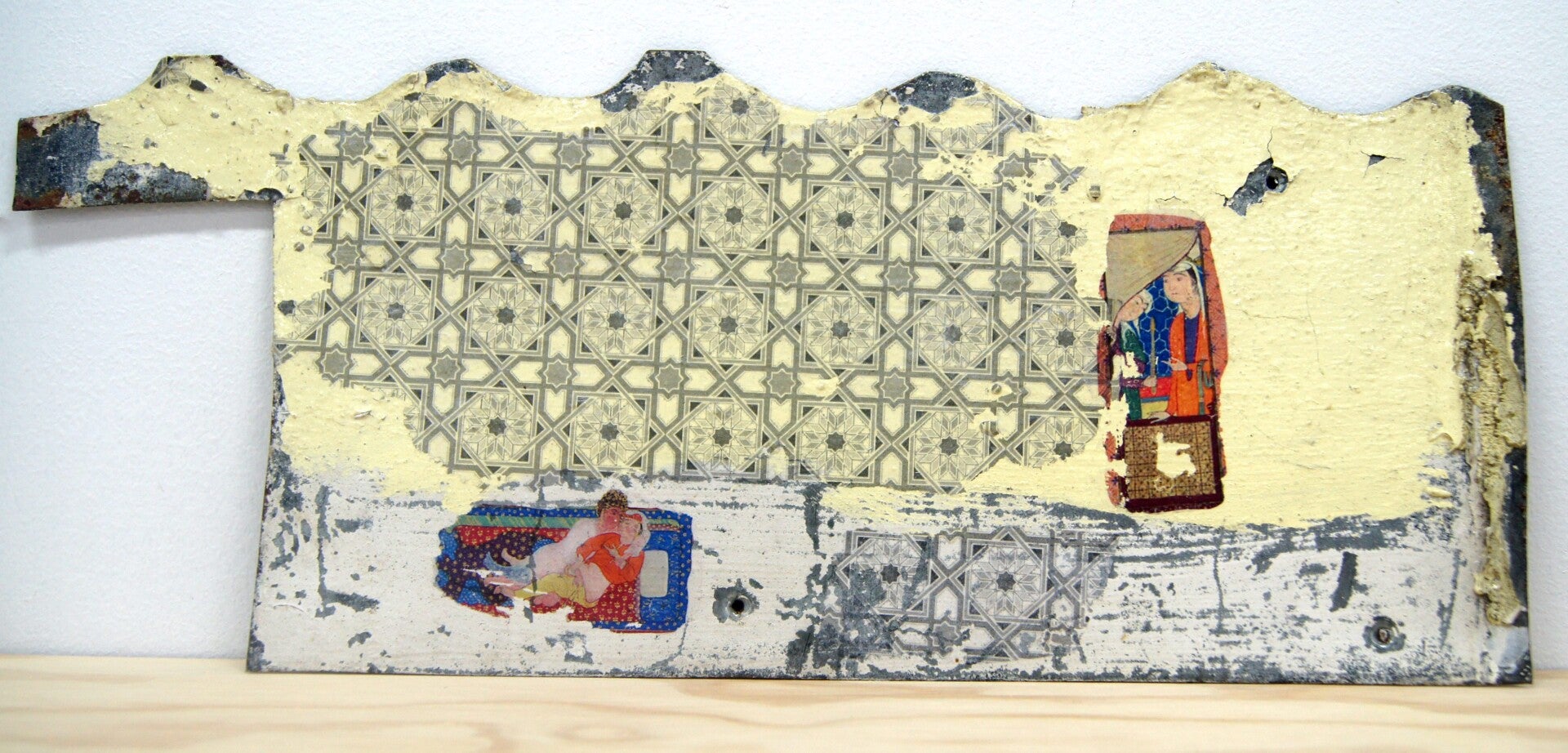 The body of work consists of pieces of historical, retro, and demolished Queensland houses and household items that are coated with applications of transferred inks and paints, then burned with patterns, text, and allegories belonging to ancient Persian motifs that once embellished books, households, and architectures in the past.