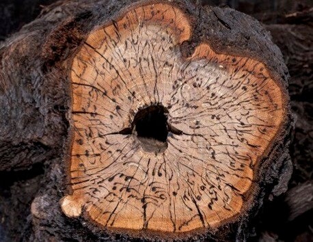 Pyrography and ink on tree stumps and tree cuts